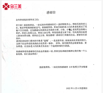 隨著錦旗一起送進(jìn)來的還有一封致謝烏蘭美康養(yǎng)院全體工作人員的感謝信,來信人是在康養(yǎng)院入住的張秀蘭奶奶的子女,他們在信中感謝工作人員對張奶奶的悉心呵護(hù)、專業(yè)照顧、辛勤付出和陪伴,更稱贊康養(yǎng)院為所有的老人提供了一個(gè)幸福溫暖的大家庭,最后祝愿康養(yǎng)院的明天更加輝煌。